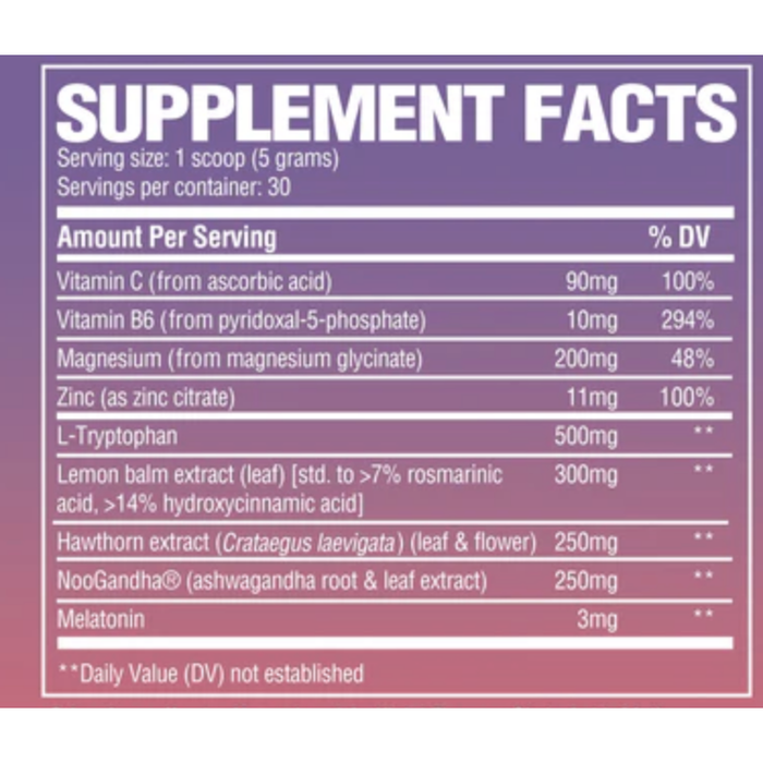 Unique ingredients in RAW Sleep include Lemon Balm extract (std. to >7% rosmarinic acid, >14% hydroxycinnamic acid), Crataegus laevigata (hawthorn) leaf and flower extract, NooGandha®, and melatonin.